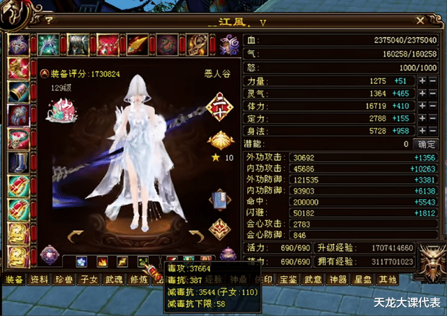 先看最新面板:血量237万,蓝量16万,命中20万,闪避5万,会心攻击2783,会心防御846!主毒攻击37664!